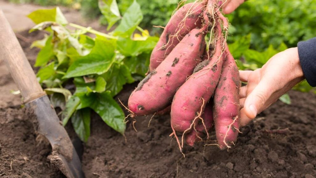 Sweet potatoes usually take about 3 to 4 months to grow. You’ll know it’s time to harvest when the leaves start turning yellow. Stop watering a week before harvesting. This helps the soil dry and makes harvesting easier.